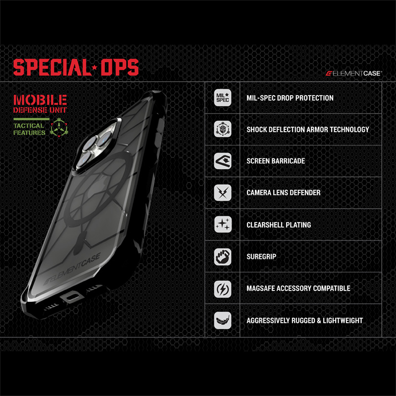 Etui Special Ops ze zintegrowanym pierścieniem magnetycznym MagSafe to wysokiej klasy obudowa ochronna o parametrach, które przewyższają standardy wojskowego certyfikatu MIL-STD-810G. Podwójnie wzmacniana konstrukcja (Shock Deflection Armor Technology) niweluje siły działające na etui oraz iPhone’a podczas gwałtownych upadków na twarde podłoże i nie tylko. Wszystkie krawędzie etui zostały ponadto zaprojektowane w taki sposób, aby zapewnić użytkownikowi maksymalnie wygodny i bezpieczny chwyt, zapewniają tym samym wysoką ergonomię używania telefonu marki Apple.