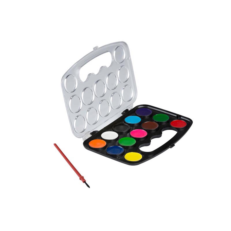 Zestaw z plastikową paletką zawiera 12 kolorów farb w pastylkach oraz pędzelek. Kolory można ze sobą mieszać oraz rozcieńczać z wodą w celu stworzenia różnych odcieni.