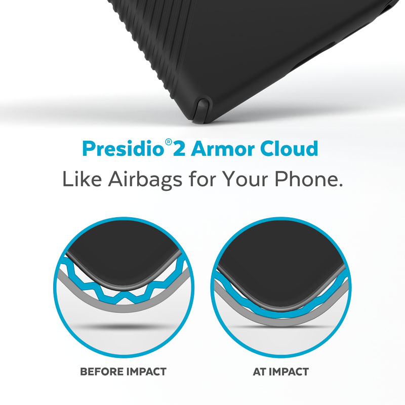 Etui Presidio2 Grip amerykańskiej firmy Speck wykonane w technologii Armor Cloud™ - system specjalnych kapsułek wewnątrz etui działa na podobnej zasadzie, co poduszki powietrze stosowane w samochodach. W momencie upadku na twarde podłoże, kapsułki amortyzują siłę uderzenia przy pomocy skompresowanego w nich powietrza. Rozwiązanie to sprawia, że etui wytrzymuje upadki z wysokości nawet 4 metrów. Podwyższona ramka ekranu chroni jednocześnie wyświetlacz telefonu i pozwala zrównać wierzchnią powierzchnię po założeniu szkła ochronnego.