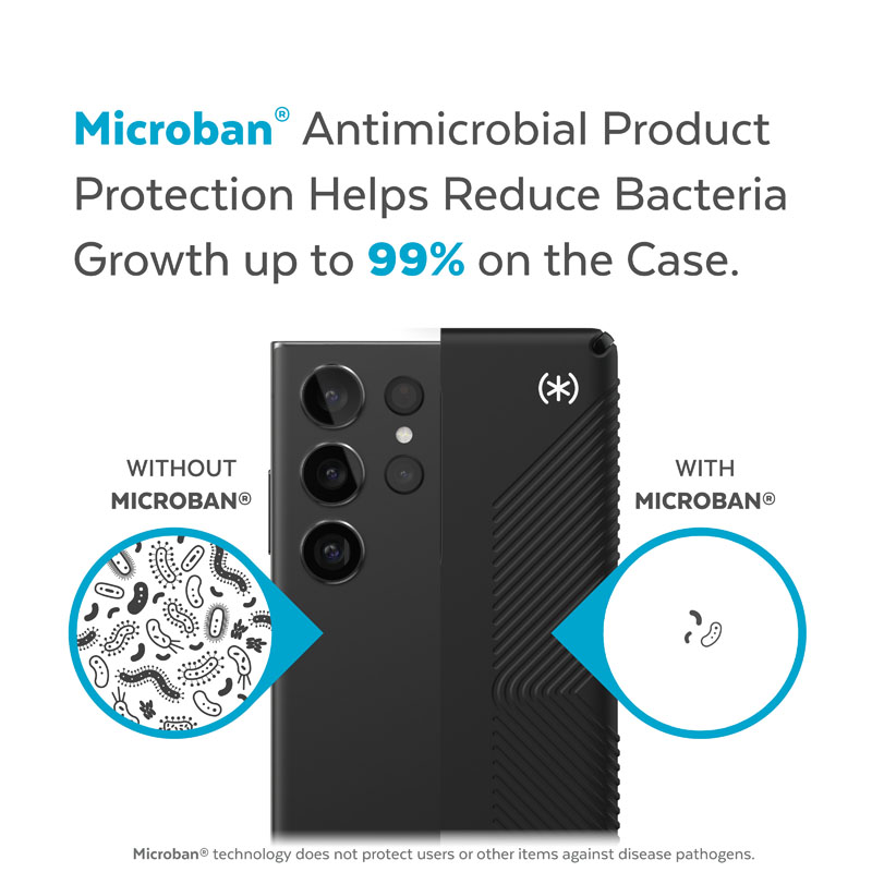 Oryginalna obudowa ochronna Speck z serii Presidio2 Grip oferuje też ochronę antybakteryjną MICROBAN® (światowy lider rozwiązań przeciwdrobnoustrojowych z szerokim portfolio ponad 25 zatwierdzonych technologii). Aktywny składnik wbudowany w strukturę etui powstrzymuje 99% bakterii, które gromadzą się na powierzchni etui. Technologia MICROBAN® zapewnia w ten sposób dożywotnią ochronę przed bakteriami powodującymi plamy i nieprzyjemne zapachy oraz działa na poziomie komórkowych, aby utrzymać czystość obudowy.