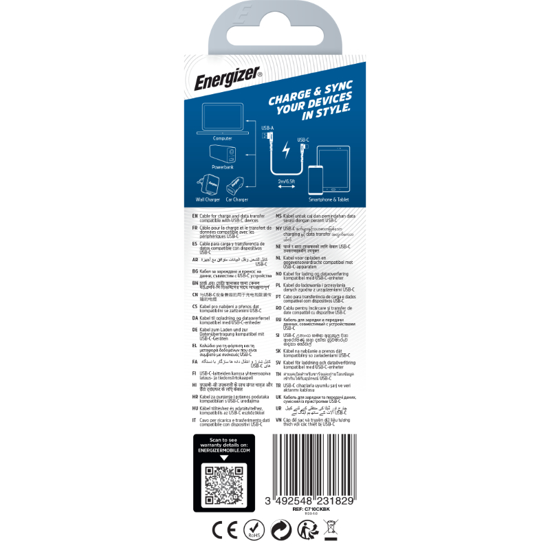 El cable de carga y transferencia de datos Energizer tiene 200 cm de longitud y cuenta con un conector USB-A a USB-C de 90°. El cable tiene forma de L para enchufarlo y desenchufarlo fácilmente.