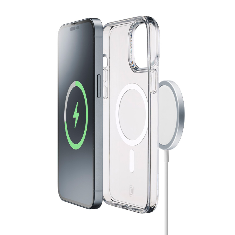 Cellularline Gloss Mag to przezroczyste etui ochronne do iPhone’a 15 Pro Max z wbudowanym magnesem do ładowarki i akcesoriów MagSafe.