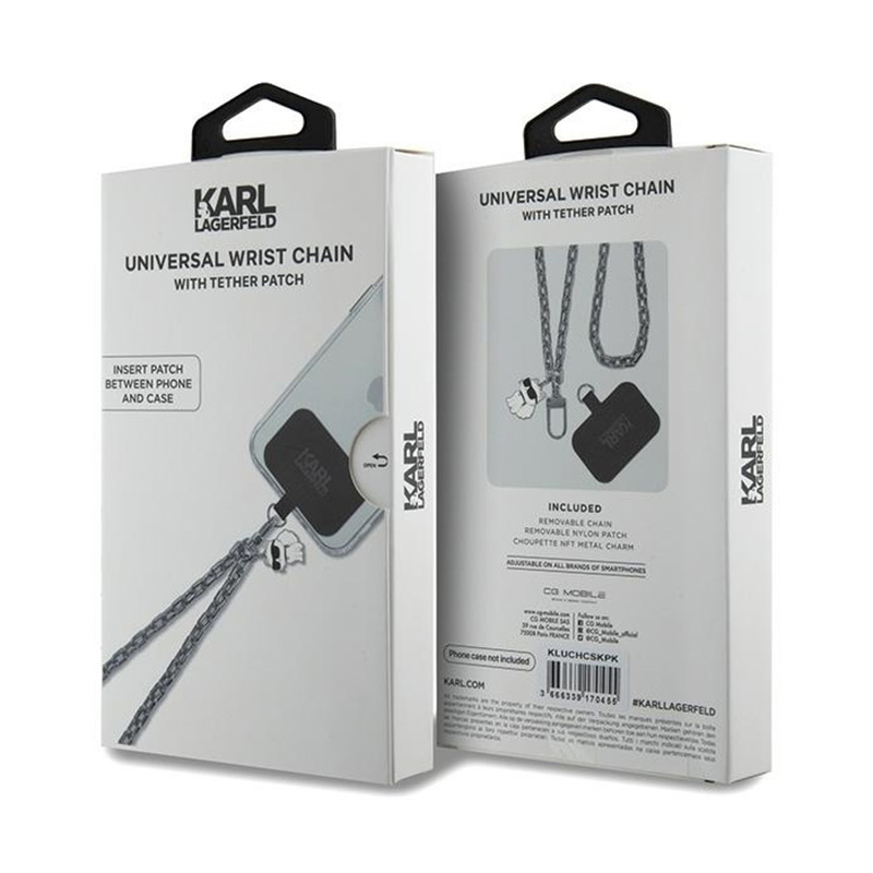 The strap is made of the highest quality materials, which ensures durability and a sleek look. A strong metal chain and silver fittings with the Karl Lagerfeld brand logo give the accessory a luxurious character. The top is a pendant with the image of Choupette, which emphasizes the prestige of the accessory.