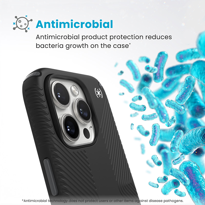 Speck Presidio®2 Grip MagSafe® con tecnología antideslizante ClickLock™ Interlock es una funda súper protectora con un imán incorporado, compatible con los accesorios MagSafe® de Apple.