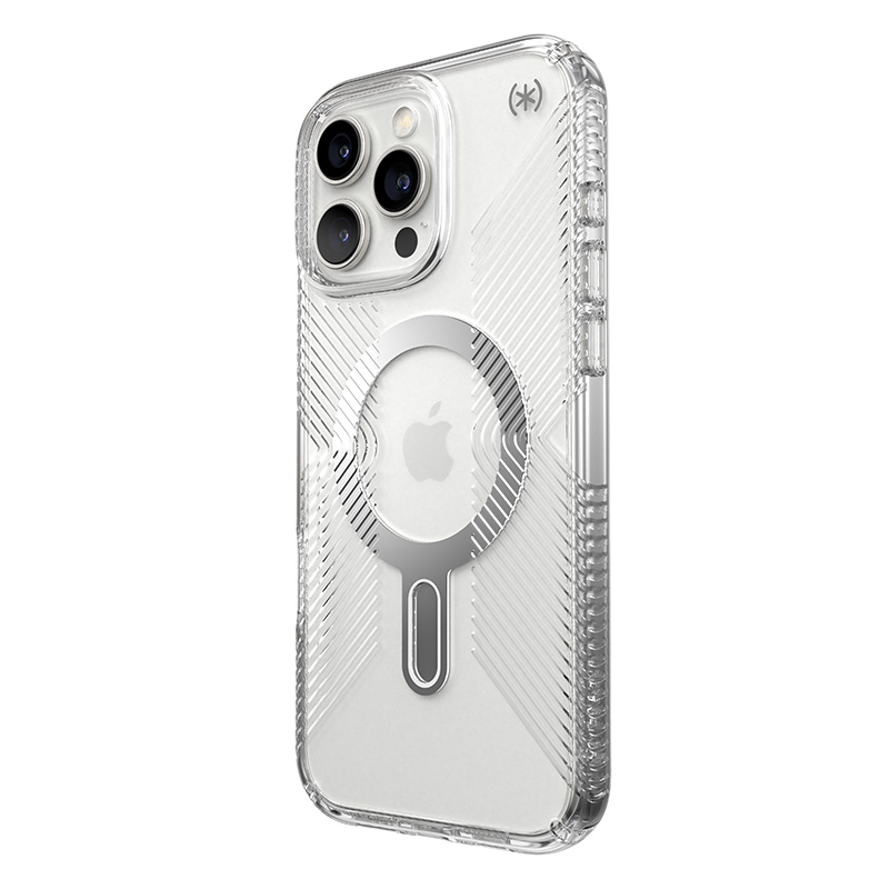 Speck Presidio® Perfect-Clear Grip MagSafe® with ClickLock™ Interlock anti-slip technology is a transparent case with built-in magnet, compatible with Apple MagSafe® accessories.
