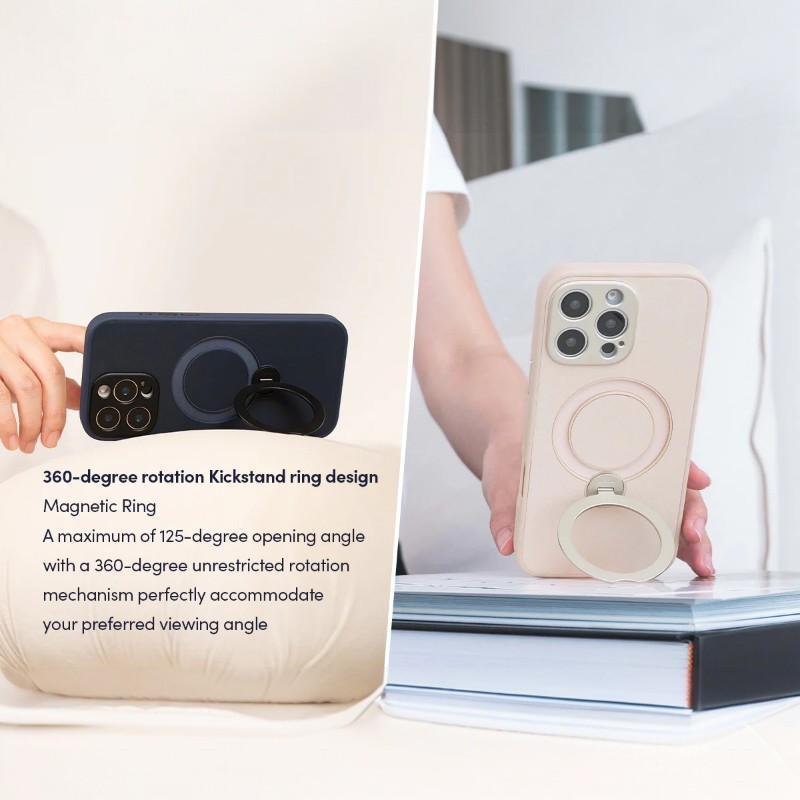 The Moshi Kameleon MagSafe case combines a minimalist design with practical features for everyday elegance and convenience. With a 360-degree rotating magnetic ring with Kickstand, you can comfortably watch video, make calls or work in portrait or landscape orientation hands-free.