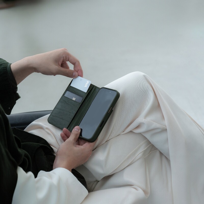 The Moshi business case with wallet function is a practical and elegant accessory for the iPhone 17 Pro. The case is equipped with three card pockets and a long pocket for cash in the form of classic banknotes.