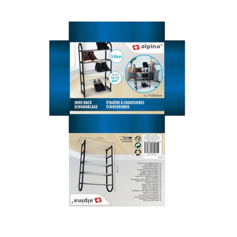 Das Schuhregal Alpina ist die perfekte Lösung für Menschen, die Wert auf Ordnung und Funktionalität legen. Dieses 5-stöckige Bücherregal bietet Platz für 10 bis 15 Paar Schuhe und eignet sich daher ideal für einen Flur, einen begehbaren Kleiderschrank, eine Waschküche sowie ein gemietetes Zimmer oder Schlafzimmer.