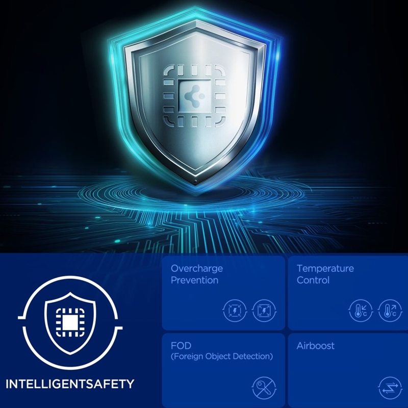 Uchwyt został wyposażony w aktywny system chłodzenia Peltiera z technologią AirBoost, który skutecznie obniża temperaturę telefonu podczas ładowania. Zapewnia to stabilną pracę i pełną prędkość ładowania nawet w upalne dni. Dodatkowo wbudowany system FOD (Foreign Object Detection) chroni przed niebezpiecznym nagrzewaniem, wykrywając obce przedmioty w strefie ładowania, a funkcja Overcharge Prevention zapobiega przeładowaniu baterii.