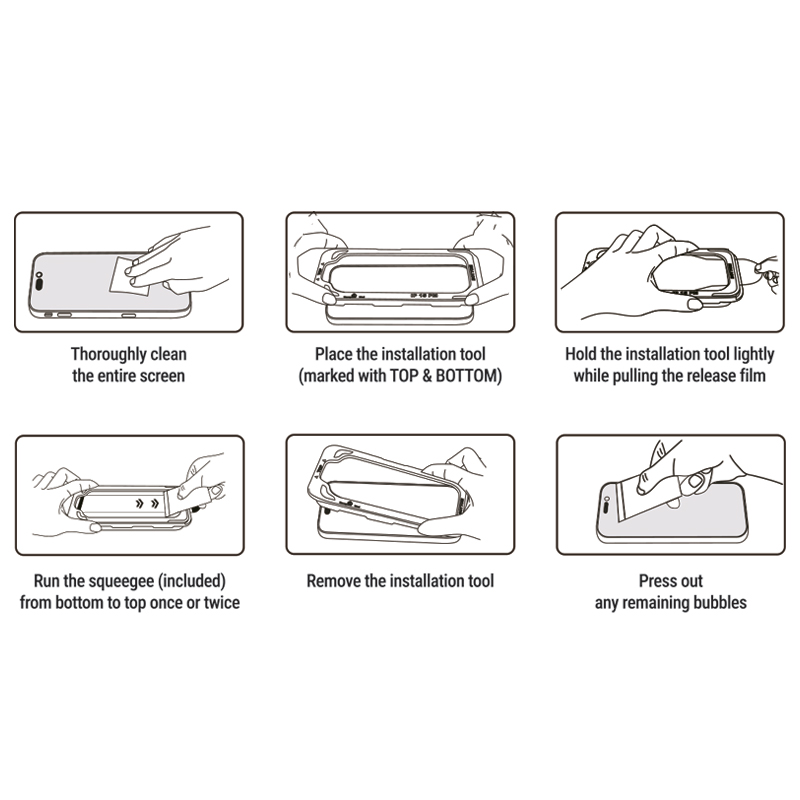 - Umieść ramkę instalacyjną na telefonie: ramka jest oznaczona napisami TOP i BOTTOM – upewnij się, że górna część znajduje się przy przednim aparacie.